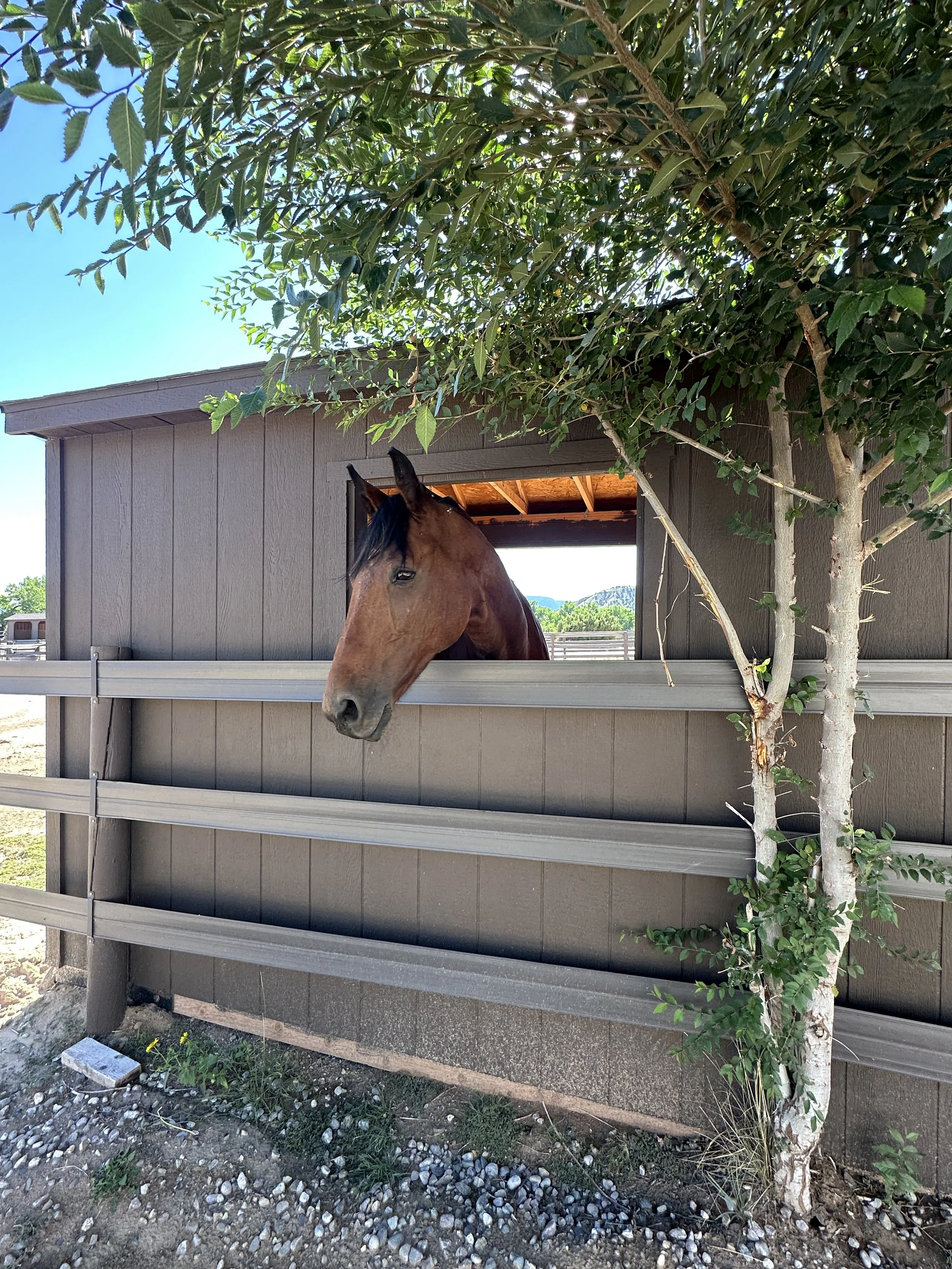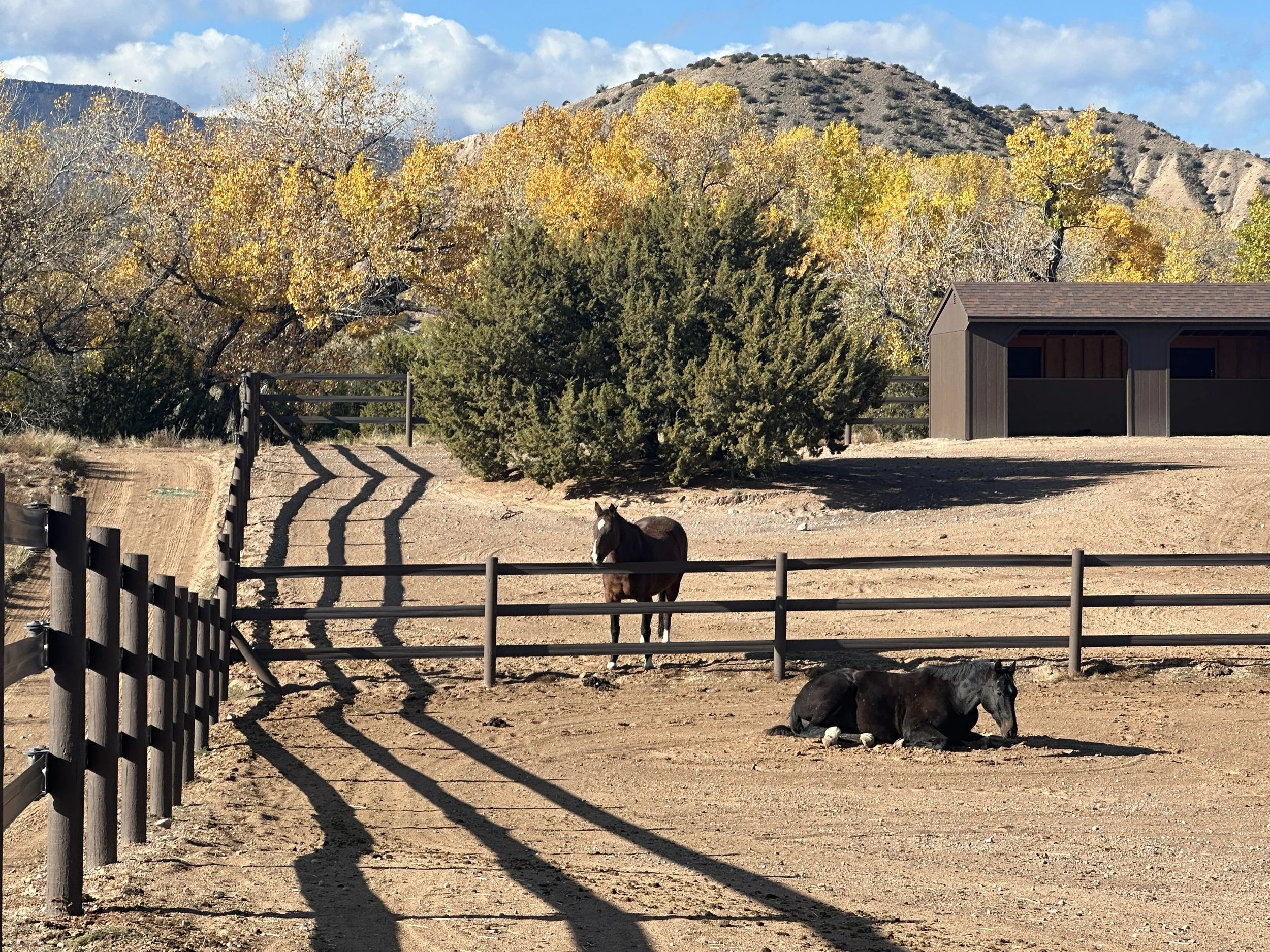 We're here to offer the best life to horse and human. Each pasture is naturally shaded with cotton wood trees, junipers and pinyon as well as a run in shed built for two or more horses.